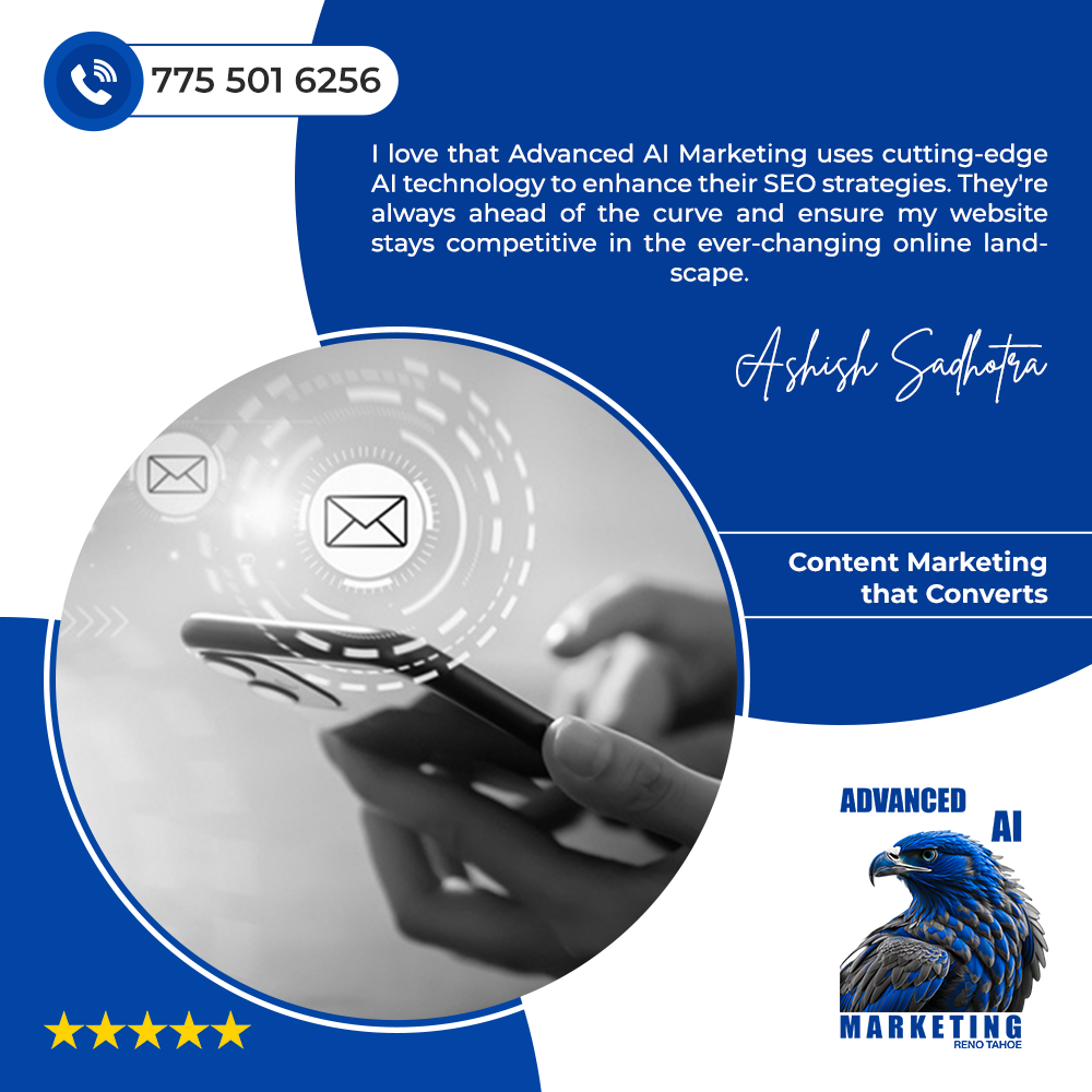 As a comprehensive SEO Agency in Reno, we know that Email Marketing is a vital part of a successful online strategy that also includes robust Social Media Marketing. These elements work together to create a powerful and cohesive online presence for your business. Our AI-driven techniques ensure these channels are aligned, amplifying your message and reaching your ideal Reno customers effectively. Let Advanced AI Marketing Reno Tahoe, your dedicated SEO Agency in Reno, show you the power of integrating intelligent Email Marketing with your Search Engine Optimization efforts for real, sustainable growth.